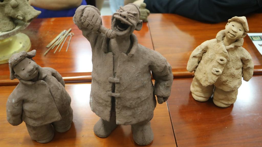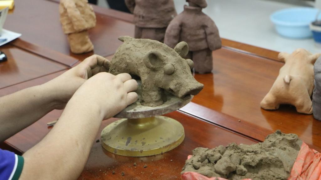 活动中,高杰首先带领同学们观看了泥塑纪录片——《泥活》,同学们通过此纪录片了解了他与泥塑的渊源以及对平度泥塑文化的传承。高杰将国画中的抽象、写意、夸张技巧融入到泥塑作品中,在传统泥塑的基础上进行创新,赋予平度泥塑新的时代气息。高杰讲解道:“制作泥塑需要经过选土、筛选、沉淀、揉泥、醒泥、塑型、阴干、烧制、彩绘等18道工序,每道工序都马虎不得,否则制作出来的作品会存在瑕疵。”随后,他向学生们展示了捏泥塑的过程,通过卷捏等技法,一只栩栩如生的小猪就展现在了同学们的面前。大家在老师的引导下也开始动手操作,捏出各种形态各异的物体,纷纷表示很有趣味。