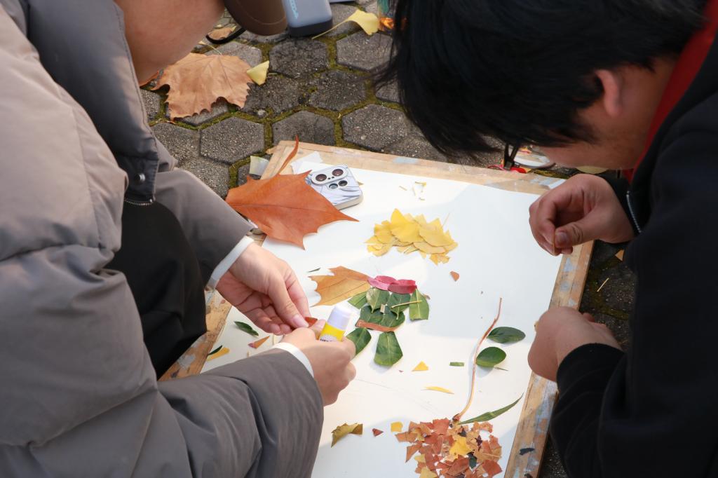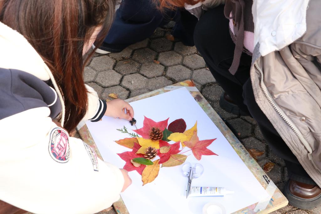 活动前期,志愿实践部的同学们主动参与筹备,带着对秋日的期待走进校园角落,捡拾形态各异的落叶,以拼贴、彩绘、剪裁等方式,将零散秋意转化为画作、书签、立体场景等作品——有的用枫叶拼出小动物,灵动可爱;有的在银杏叶上绘出绽放的花束,温柔治愈。活动展示现场,这些落叶作品有序陈列,金黄、橙红的色调瞬间拉满秋日氛围,引得路过师生纷纷驻足。大家一边欣赏作品里藏着的巧思,一边讨论落叶创作的创意,不少人表示,看着原本要凋零的落叶在指尖“重生”,既感受到了金秋的独特韵味,也体会到了低碳美学的乐趣,更定格了专属于这个秋天的温暖记忆。现场氛围轻松惬意,满是秋日里的鲜活与治愈。