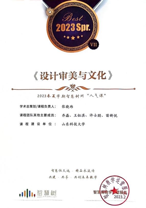 《设计审美与文化》获智慧树网“2023年春季学期人气课程”
