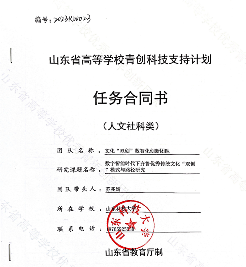 山东省高等学校青创团队科技计划《文化“双创"数智化创新团队》