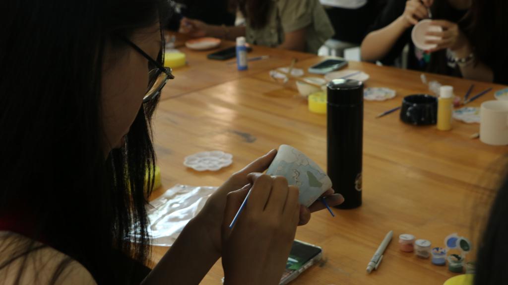 活动伊始,甄珍向师生们讲述了釉下彩陶瓷的历史和特点,介绍了从制泥、拉坯、修坯、洗水、素烧、勾线、分水、喷釉到烧成的过程,充分彰显了工匠精神和创新意识。甄珍老师通过生动的讲解和丰富的实例,让大家对釉下彩有了更为深入的了解。随后,师生们纷纷动手实践,体验釉下彩陶瓷艺术的创作过程。“大家上釉彩时,颜色厚度在1毫米到2毫米之间,太厚烧制出来颜色裂开,薄了不容易显色。”在甄珍老师的专业指导下,大家先在素坯上绘制出精美的图案,然后涂上各种颜色的釉料。虽然过程中遇到了不少挑战,但大家都乐在其中,享受着创作的乐趣。